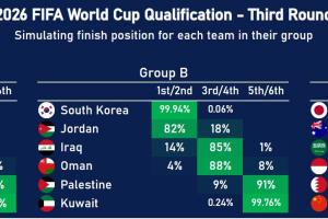 其中中国队20%排3/4(附加赛),80%排在5/6(无缘世界杯),而印尼58%概率获得附加赛资格。